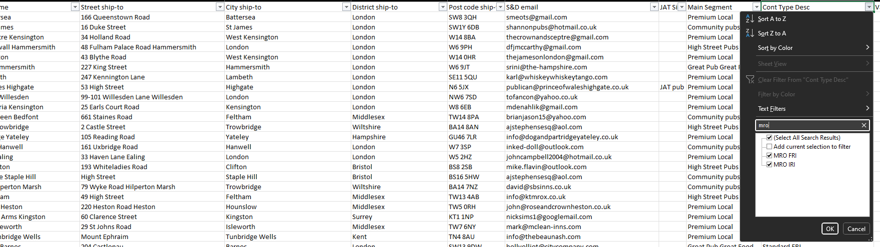 10. Filter column J 'Cont Type Desc' to see sites listed as "MRO FRI" or "MRO IRI".