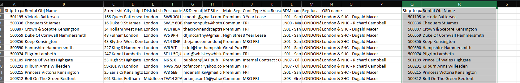5. Open both files and copy columns A and B 'Ship-to party' and 'Rental Obj Name' from last weeks' file to the new one.