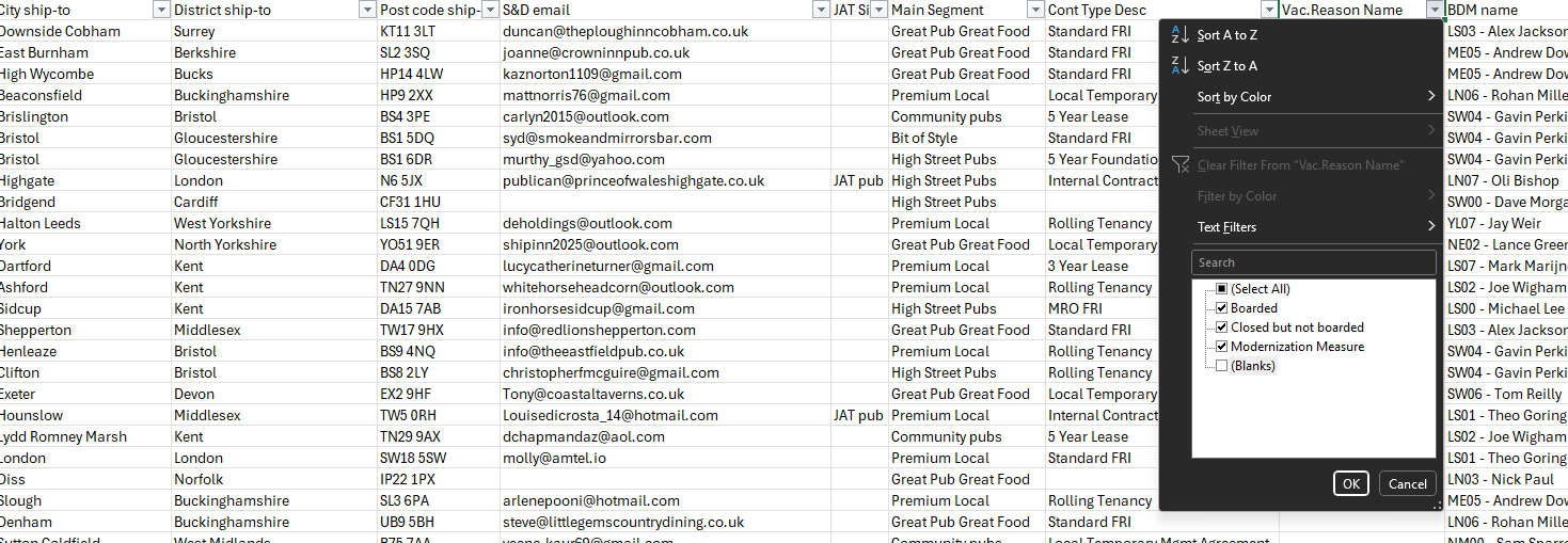 12. Filter Column K "Vac.Reason Name" to see sites that are currently closed.