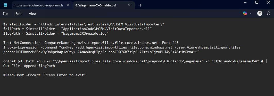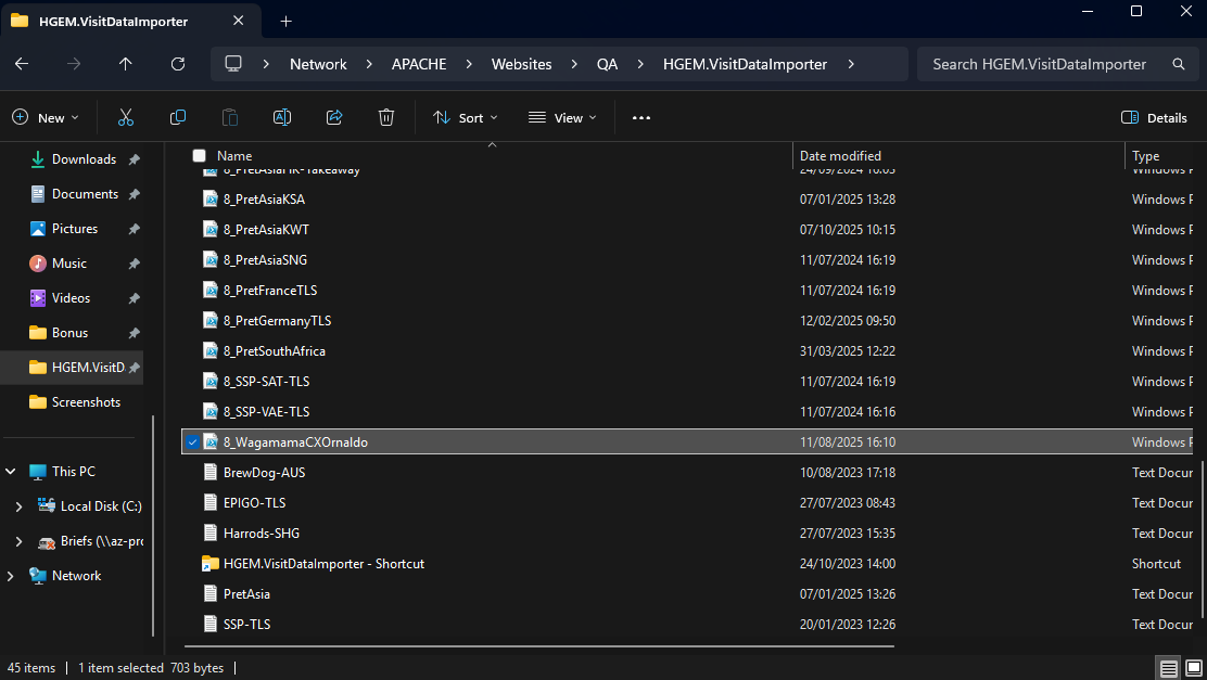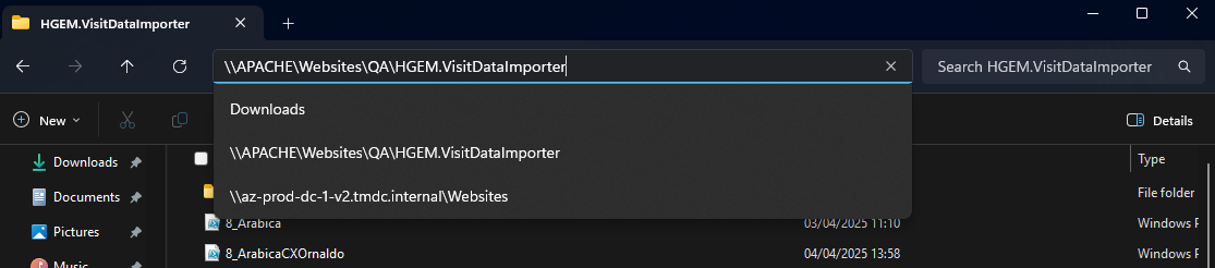 3. Find the relevant PowerShell script in the folder \\APACHE\Websites\QA\HGEM.VisitDataImporter - this folder pathway can be copied into the File Explorer.