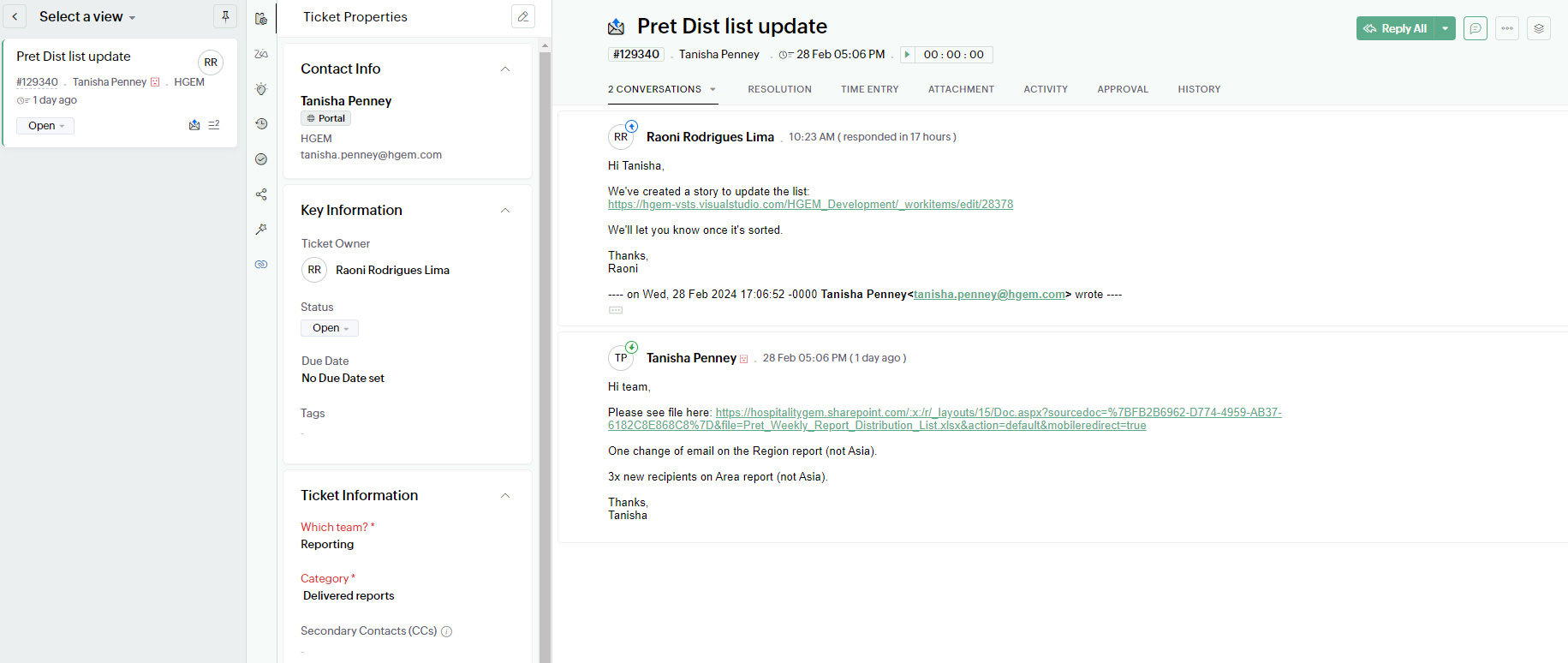 Detail which report needs to be updated, the desired deadline if any, and link the distribution list. Example ticket is below: